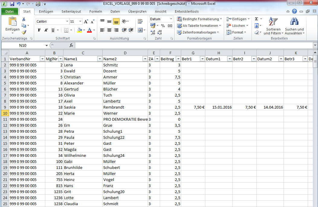 Diese Funktion dient zur Erfassung der Barzahlungen per EXCEL über eine Vorlage. Die Vorlage enthält die Mitglieder-Kenndaten. In weiteren Spalten werden die Zahlungsbeträge erfasst. Die in der Excel-Vorlage offline erfassten Daten können anschließend in die ZMAV importiert werden.