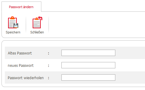• Zur Änderung muss zuerst das alte Passwort eingegeben werden. • Anschließend kann ein neues Passwort definiert werden. • Danach muss das neue Passwort wiederholt werde. • Speichern schließt die Änderung ab.